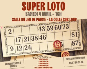 Le SPCOC Gymnastique Rythmique est heureux de vous inviter à son grand loto annuel ! 📅 Date : Samedi 4 avril 2026🕓 Horaire : Début des parties à 16h📍 Lieu : Salle du Jeu de Paume, 06480 la Colle sur Loup Venez partager un moment convivial en famille ou entre amis dans une ambiance chaleureuse et festive. De nombreux lots sont à gagner :Bons d’achatPaniers …
